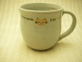 おすましにゃんこの裏はお魚の絵がついた瀬戸焼のマグカップ。上品な光沢で使いやすいです。コロンとした掌にすっぽり収まるサイズです。同じサイズの青色もあります。